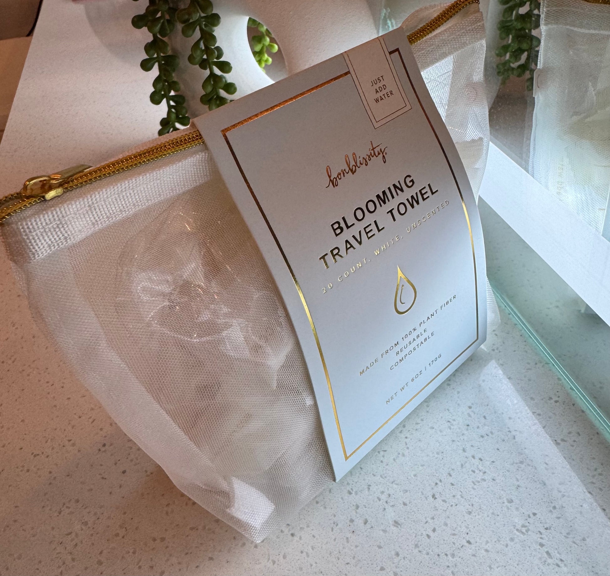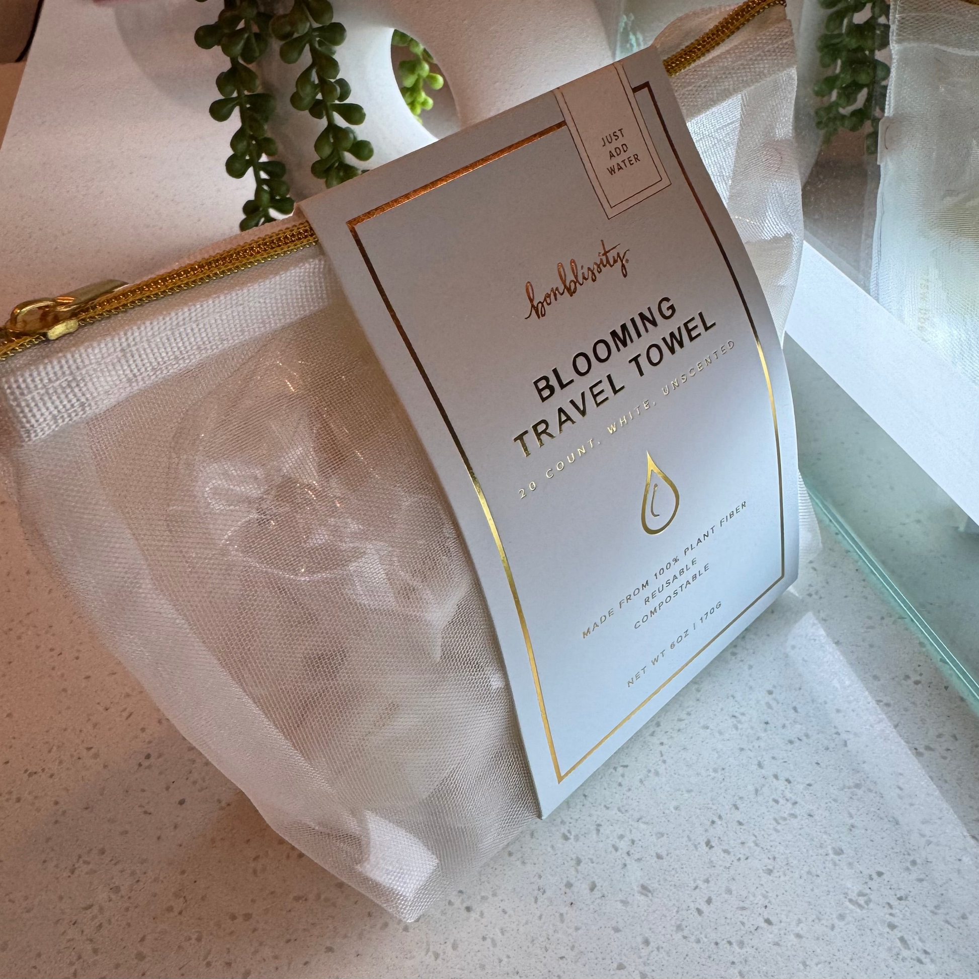 Bonblissity 20 count, white travel towels with mesh pouch. Unscented plant-based, reusable travel towels. Towels are individually wrapped. Just add water and watch towel bloom in the most satisfying way.